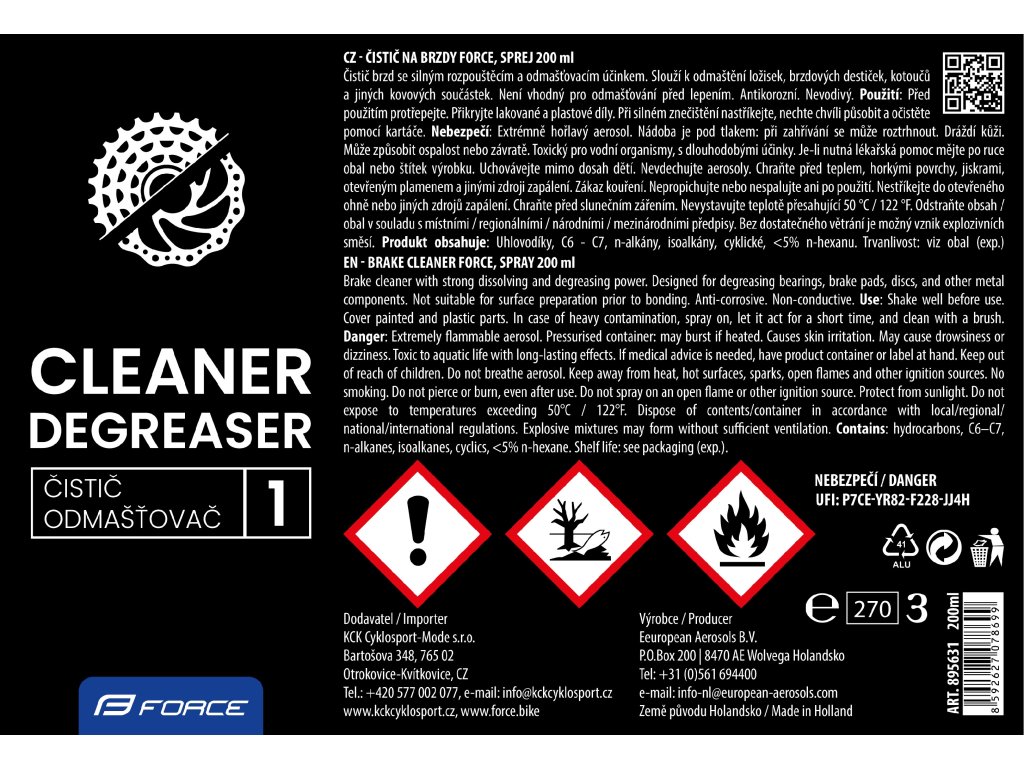 čistič FORCE na brzdy je čistidlo/ odmašťovadlorychle odstraňuje mastnoty, oleje, nečistoty a brzdové kapalinyvhodný k odmaštění řetězu před…