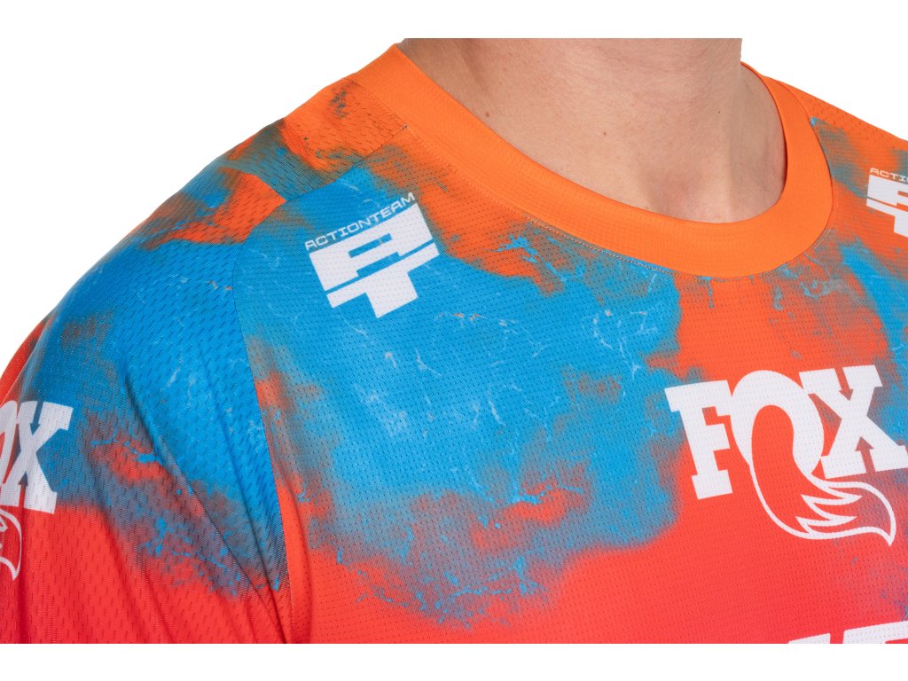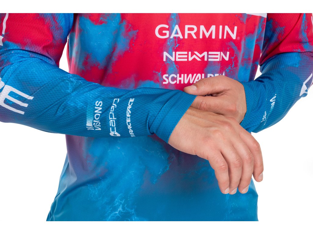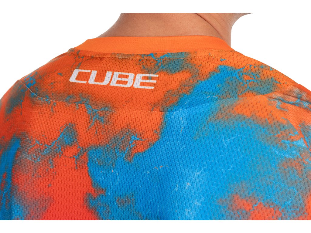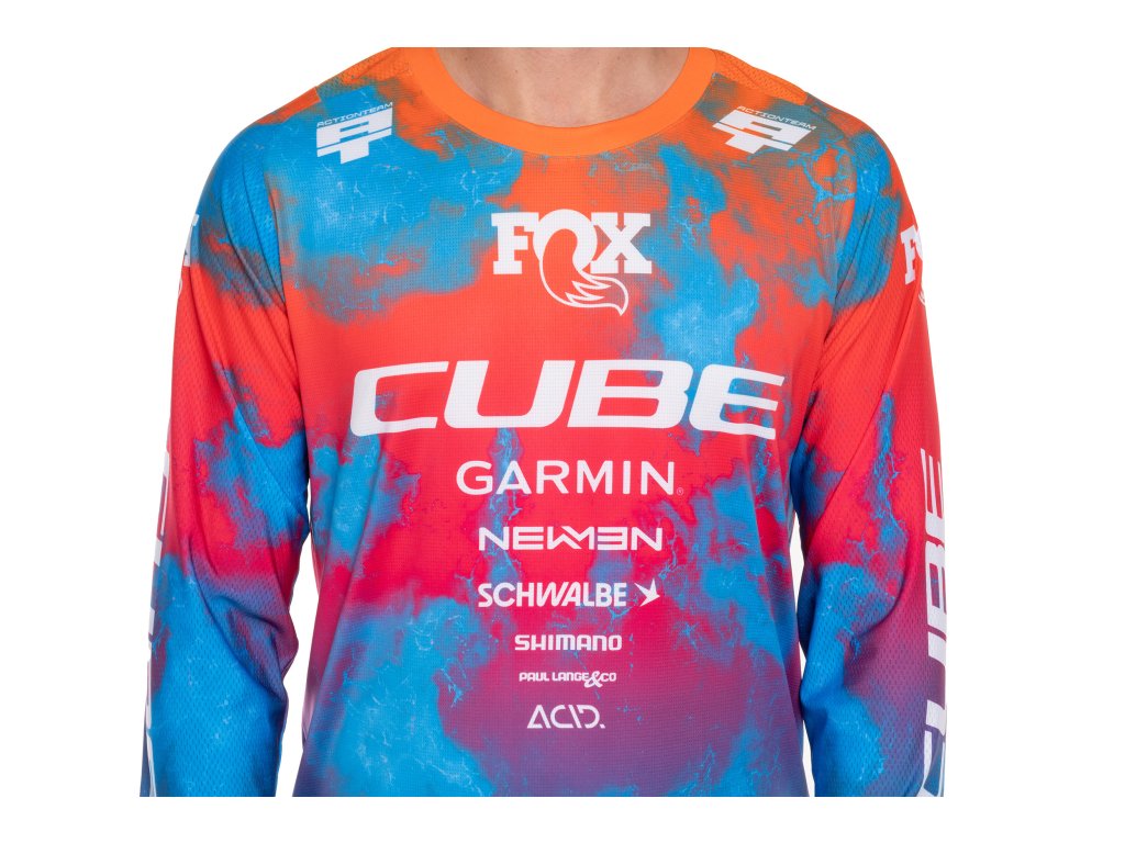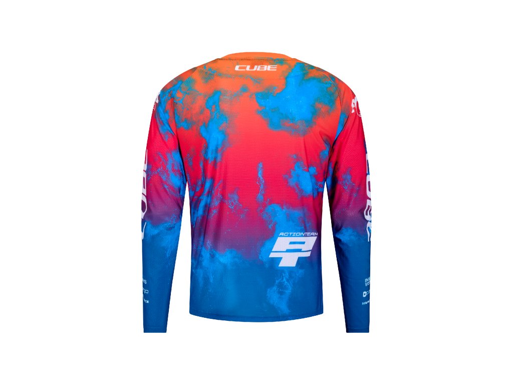 Lehký MTB dres s dlouhým rukávem CUBE X Actionteam s kapsou na permanentku, prodlouženým zadním dílem a kompatibilitou s chráničem krku.