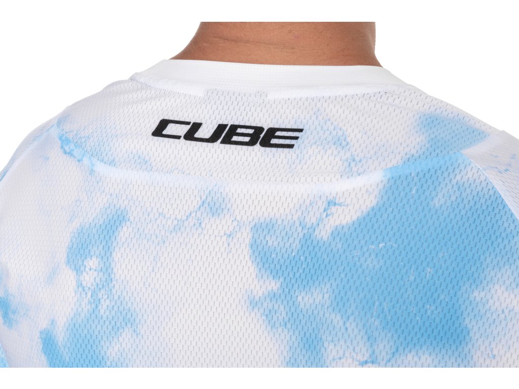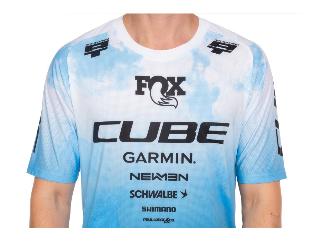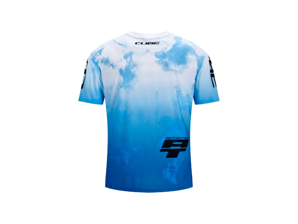 Lehký a prodyšný MTB dres CUBE X Actionteam s kapsou na permanentku, prodlouženým zadním dílem a kompatibilitou s chráničem krku.