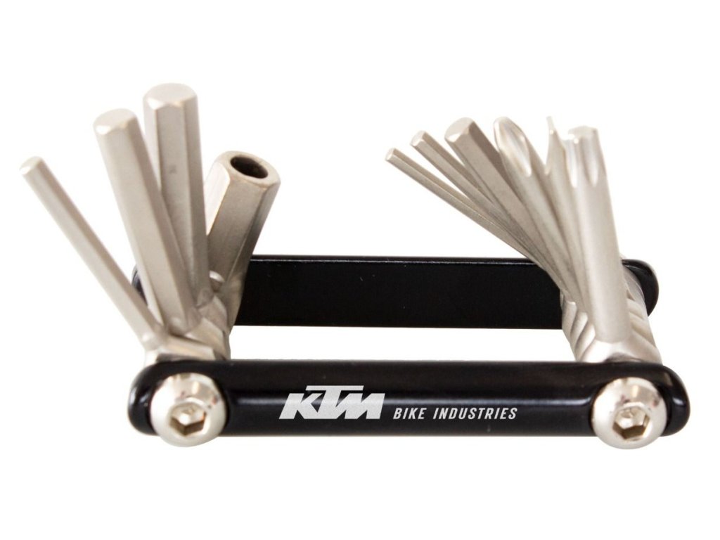 Kompaktní KTM MULTITOOL 10 je kvalitní cyklistický multiklíč s 10 praktickými funkcemi. Díky super plochému designu se snadno vejde do kapsy nebo podsedlové brašny. Vyroben z odolné oceli s chromovou povrchovou úpravou, která zajišťuje dlouhou životnost. Váží pouhých 126 g – ideální společník na každou vyjížďku.