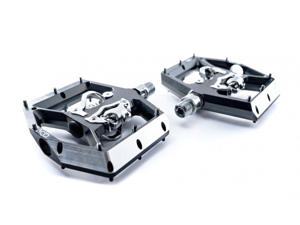 CUBE ACID CLICK A2-ZP jsou robustní MTB pedály navržené pro maximální kontrolu a výkon v náročném terénu. Na jedné straně nabízejí nastavitelný protiskluzový povrch s 16 vyměnitelnými kolíky, zatímco druhá strana disponuje klipovým systémem kompatibilním se SPD, který zajistí pevné spojení s kolem.