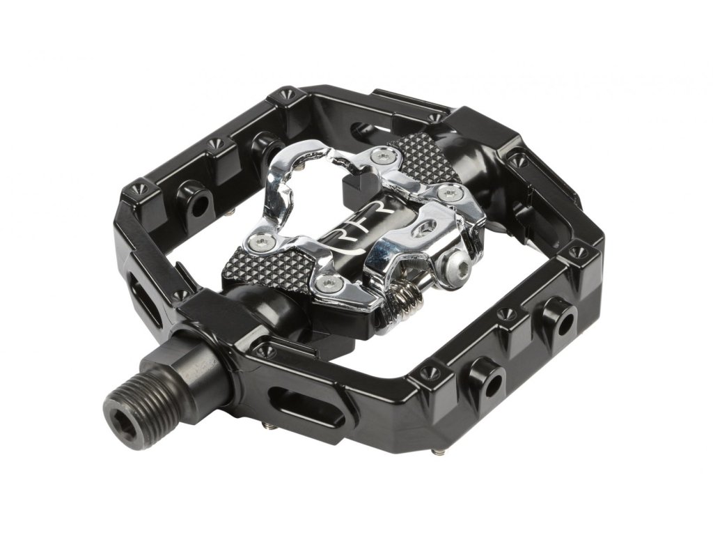 Tento plochý pedál s jednostranným click-systémem je kompatibilní s SPD a je nainstalován s CNC obráběnou CrMo osou. Vyměnitelné protiskluzové kolíky zajišťují dokonalou přilnavost na kole.