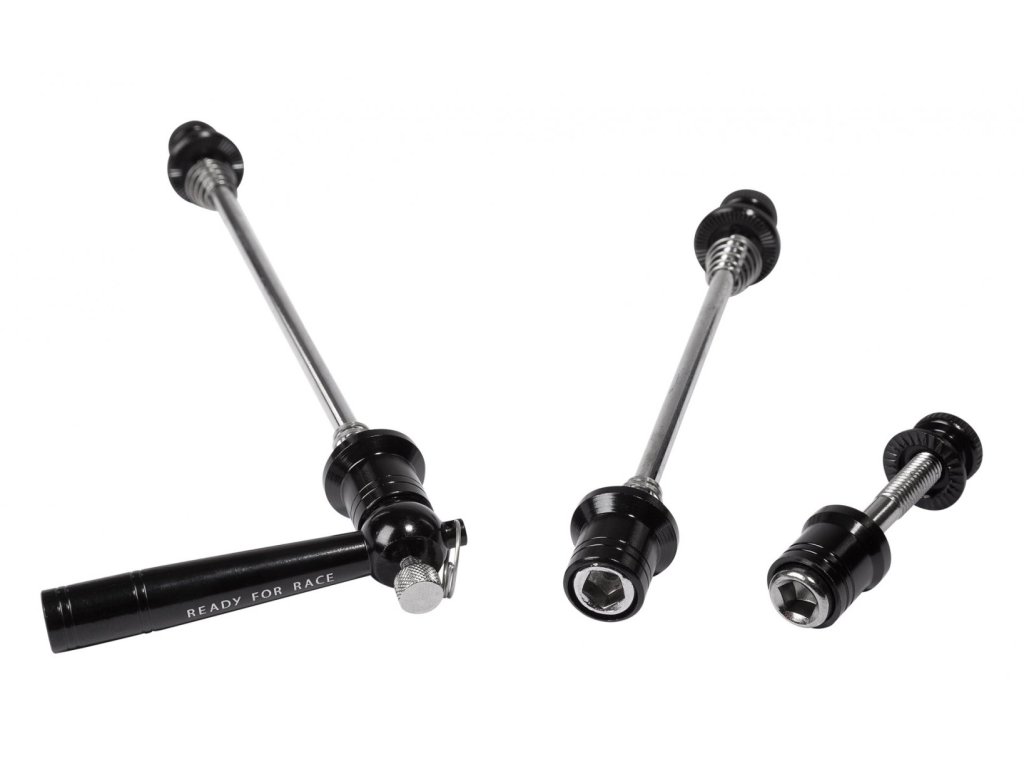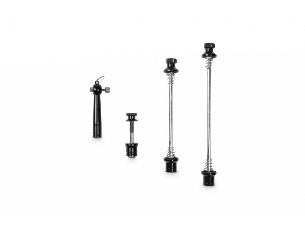 CrMo náprava, ochrana proti krádeži, velmi lehká, snadná montáž. Upevňovací rozměry pro zadní kolo jsou 165/170 mm, pro přední kolo 100/110 mm a pro šroub sedlovky max. 28 mm.